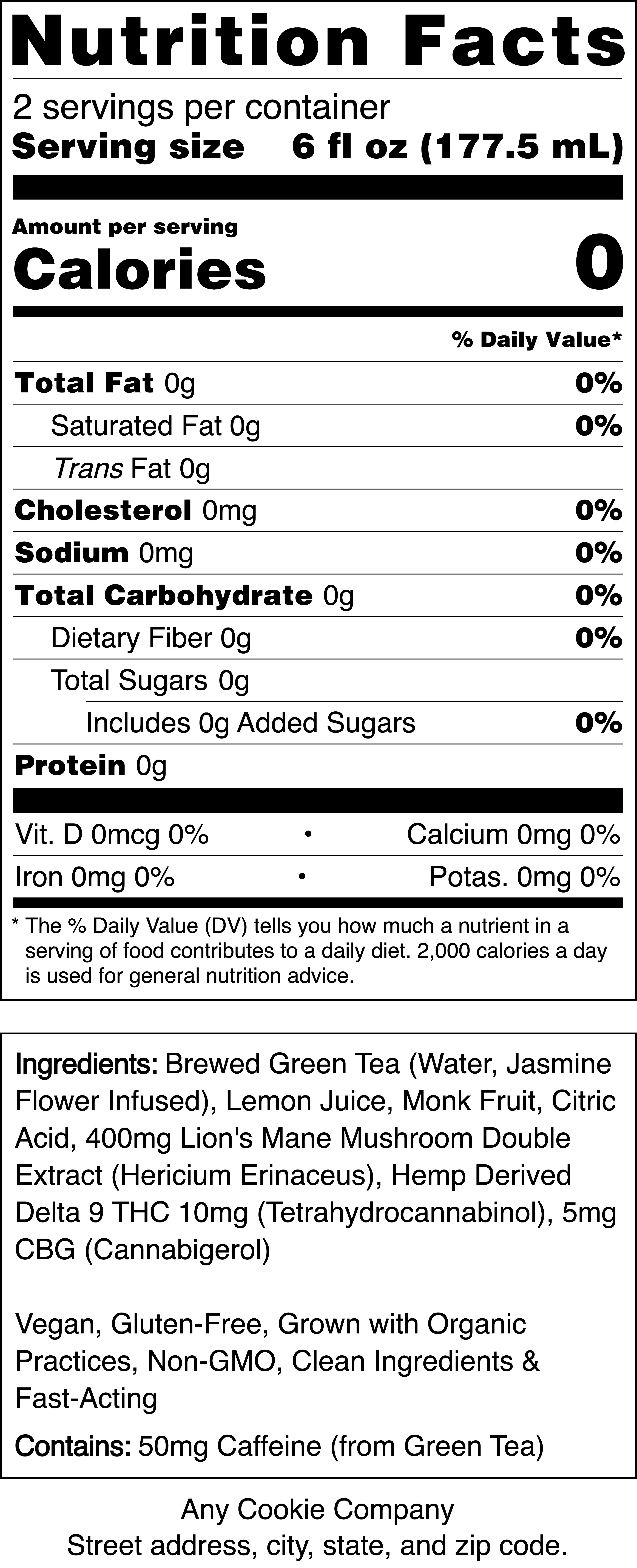 OTHER INGREDIENTS: Tea (Water, Jasmine Flower-Infused Camelia Sinensis), Lemon Juice, Monk Fruit Extract, Citric Acid, 400mg Lion’s Mane Mushroom Double Extract (Hericium Erinaceus), 10mg of Hemp Derived THC, 5mg CBG