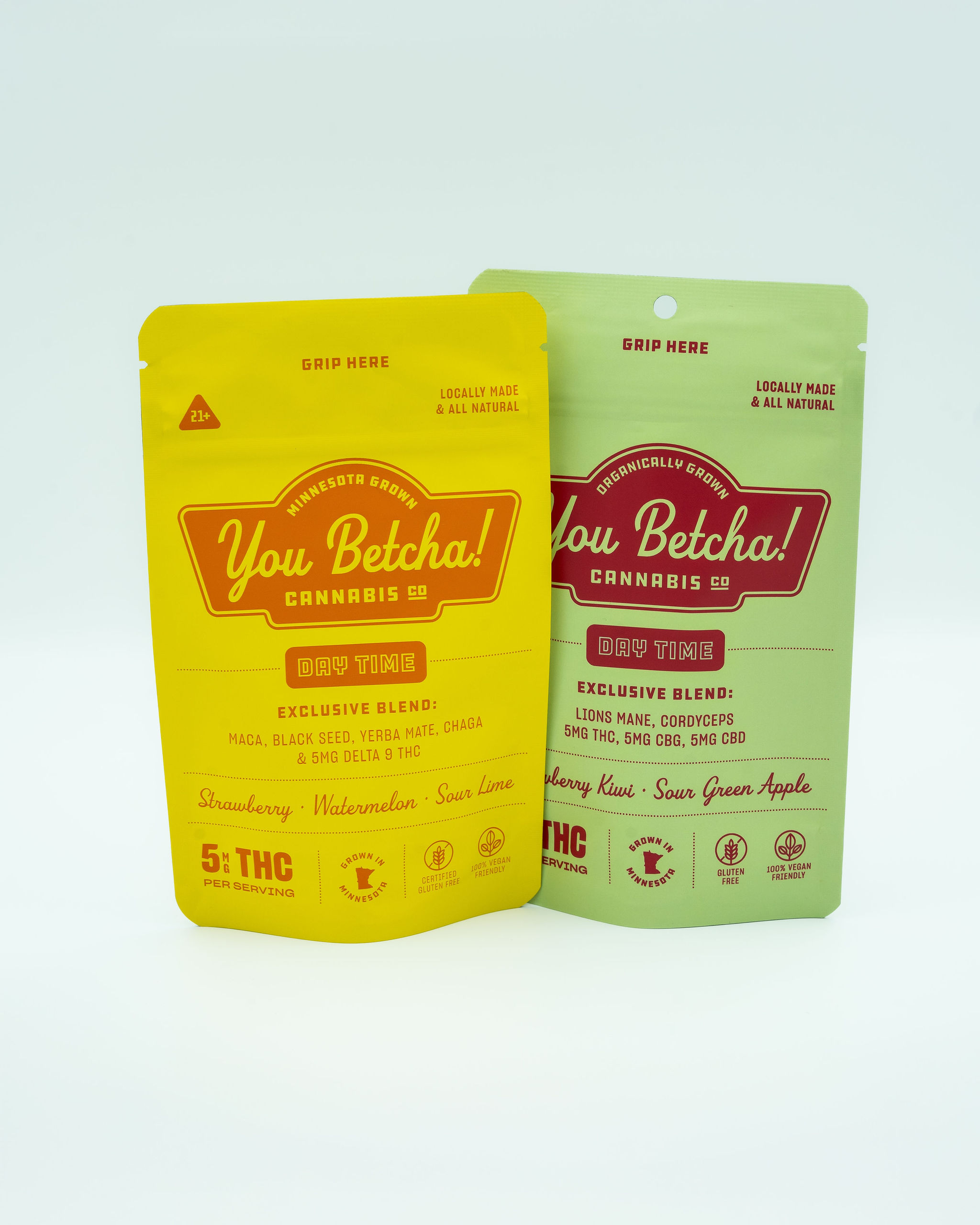 Looking to boost performance, stay focused, energized and active? YOU BETCHA! These NEW, feel-good, 5mg THC Day Time Gummies will take you to a tropical fruity paradise! Dive into the luscious, sweet, juicy Strawberry Kiwi flavor paired perfectly with the irresistible zing of Sour Green Apple. A flavor adventure you don’t want to miss! We included additional cannabinoids, CBG and CBD to enhance your euphoric buzz, along with the addition of high-performing functional mushrooms, Lion’s Mane and Cordyceps to uplift your day and improve your wellness. Our delicious gummies are designed to elevate your experience, boost your energy and support your overall wellness. Grab a pack of our very flavorful Day Time Gummies today!