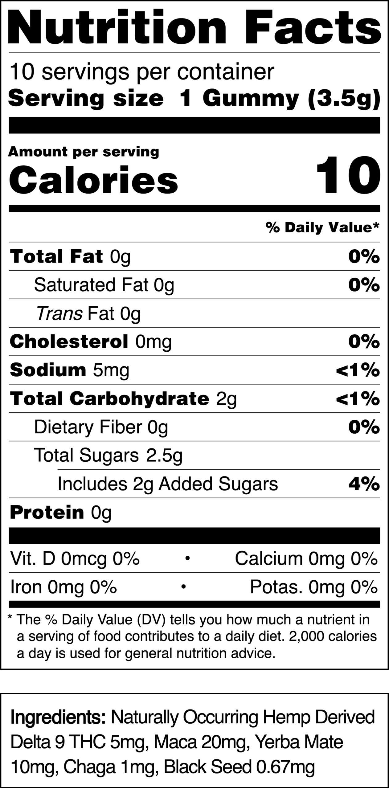 These delicious Day Time Gummies are supplemented with our signature, high-quality naturally occurring hemp derived 5mg THC, Maca, Yerba Mate, Chaga and Black Seed.